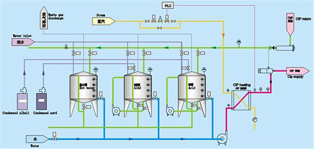 CIP站由碱罐、酸罐、消毒水罐、热水罐组成。它应做到以下几点功能: