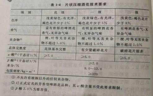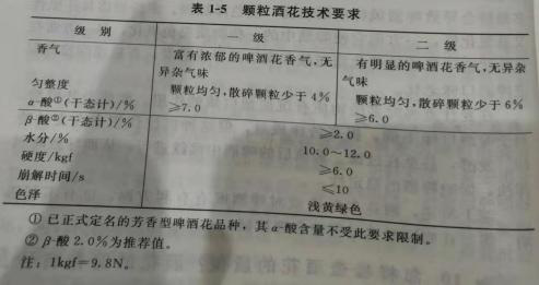 要按照国家统一的标准来检查酒花的质量,国家标准(GB10347.1—89)分别对片状酒花和颗粒酒花作了技术要求,见表 1-4、表1-5。
