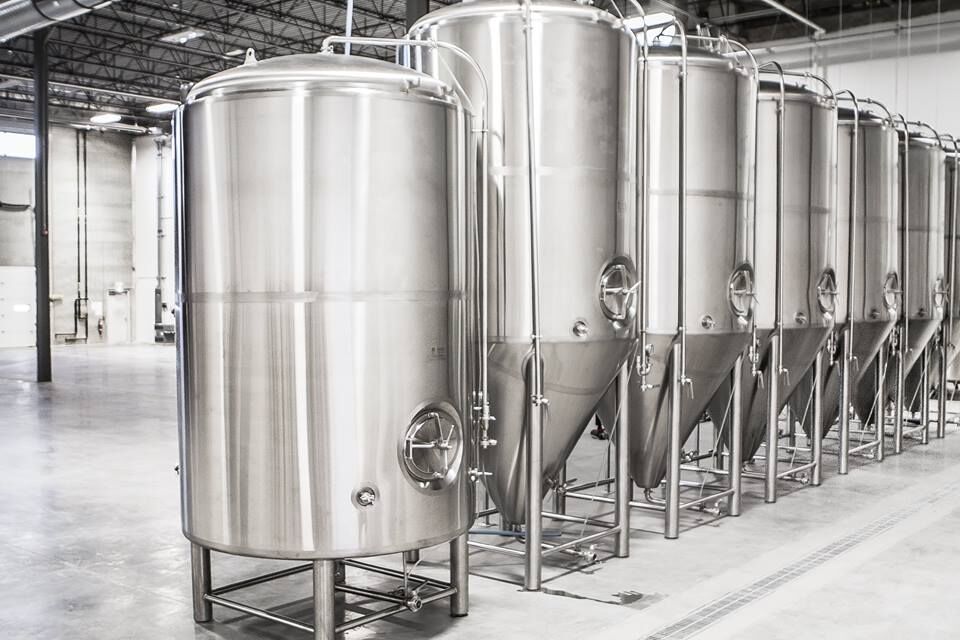 这些不锈钢罐是发酵容器,用于在过滤、碳酸化和包装之前发酵和调节啤酒。